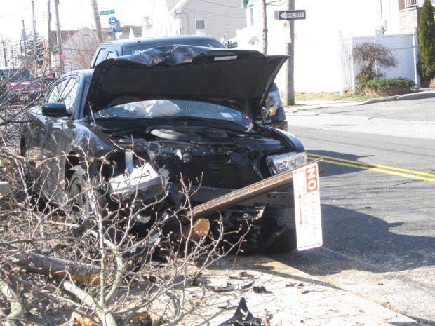 TOTTENVILLE — A man crashed his brand new car into two trees and a no parking sign on a Tottenville street Monday morning while swerving to avoid another car, his father said.