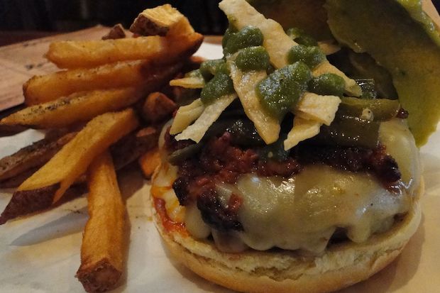 Here's the Muchacho burger, topped with sausage, avocado, tortilla strips, cheese and peppers.