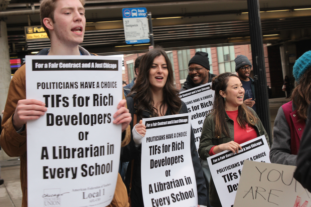 Chants from the group like "Furlough Rahm, furlough Rauner, striking makes our movement stronger" and "We need teachers, we need books, we need money that Rahm took" rang out at the busy corner.
