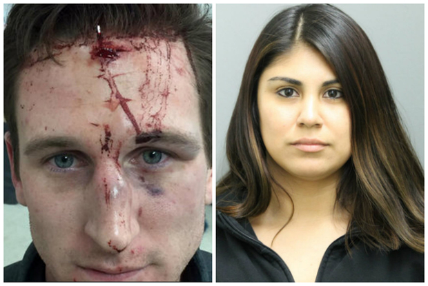 Bob Zwolinski, left, the night of the attack, and the woman who allegedly put the staple in his forehead, Jessica Soto. (Zwolinski, Chicago Police)
