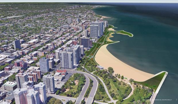 Smith and Gill's rendering of the lakefront project looking north over Kathy Osterman and Thorndale Beaches in Edgewater. [Provided/Smith and Gill]