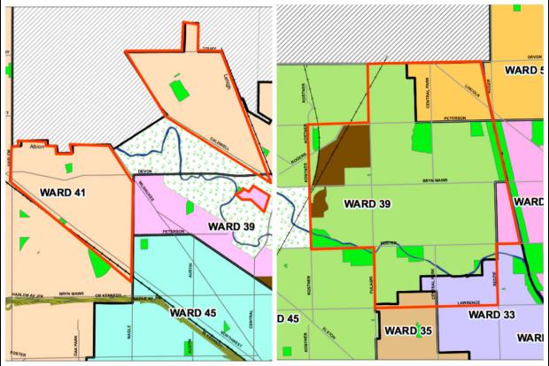 Spraying is scheduled to begin at dusk and continue until approximately 1 a.m. in the areas outlined in red, officials said. [Chicago Department of Health]