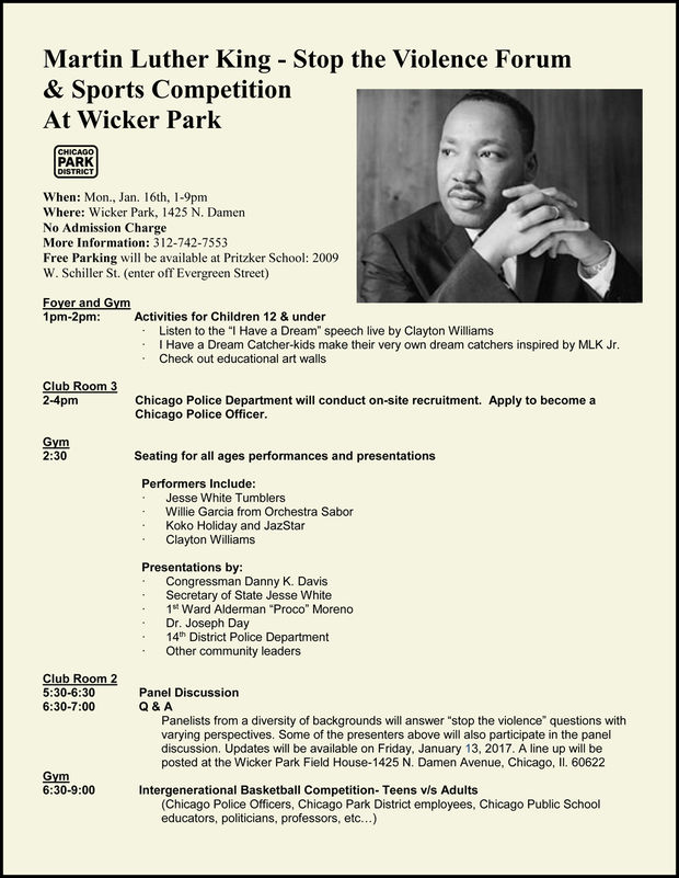 Set for 1 p.m. to 9 p.m. Monday, the Chicago Park District's "Stop The Violence" forum and sports competition will kick off with King's famous "I Have a Dream" speech, followed by a dreamcatcher-making session, performances by the Jesse White Tumblers, Chicago Police Dept. recruitment and a "Teens vs. Adults" basketball tournament.