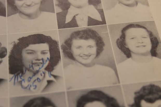 Nancy Cawley's yearbook picture (center) during her junior year of high school in Chicago. [Visitation High School 1949 Yearbook]