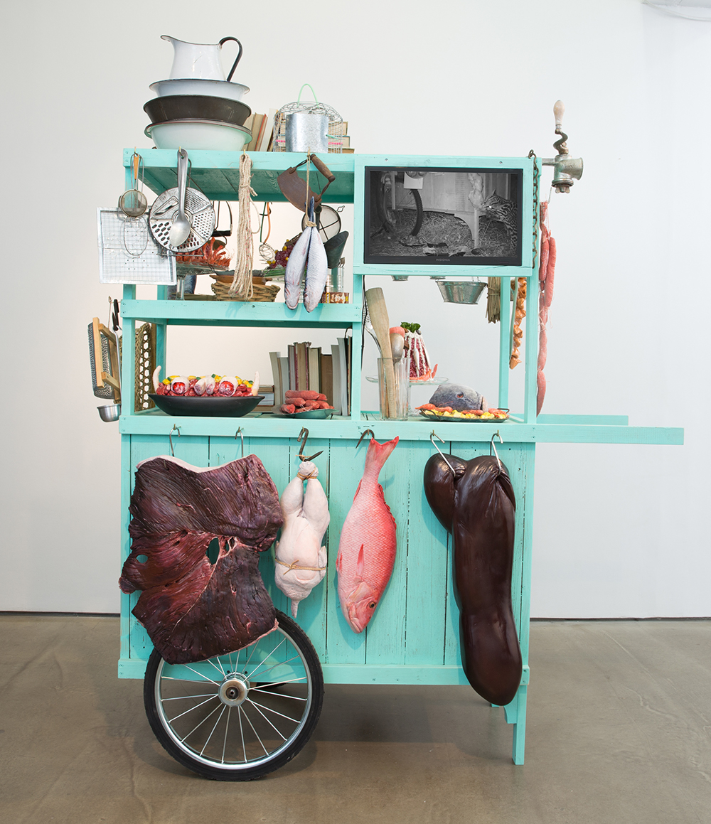The centerpiece of Sherwood’s exhibit is a food cart, which houses a video monitor that displays video footage from Sherwood’s time in Brazil.