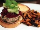 A spiced turkey burger, hoisin cranberry sauce and sweet potato fries put a fresh spin on Thanksgiving.